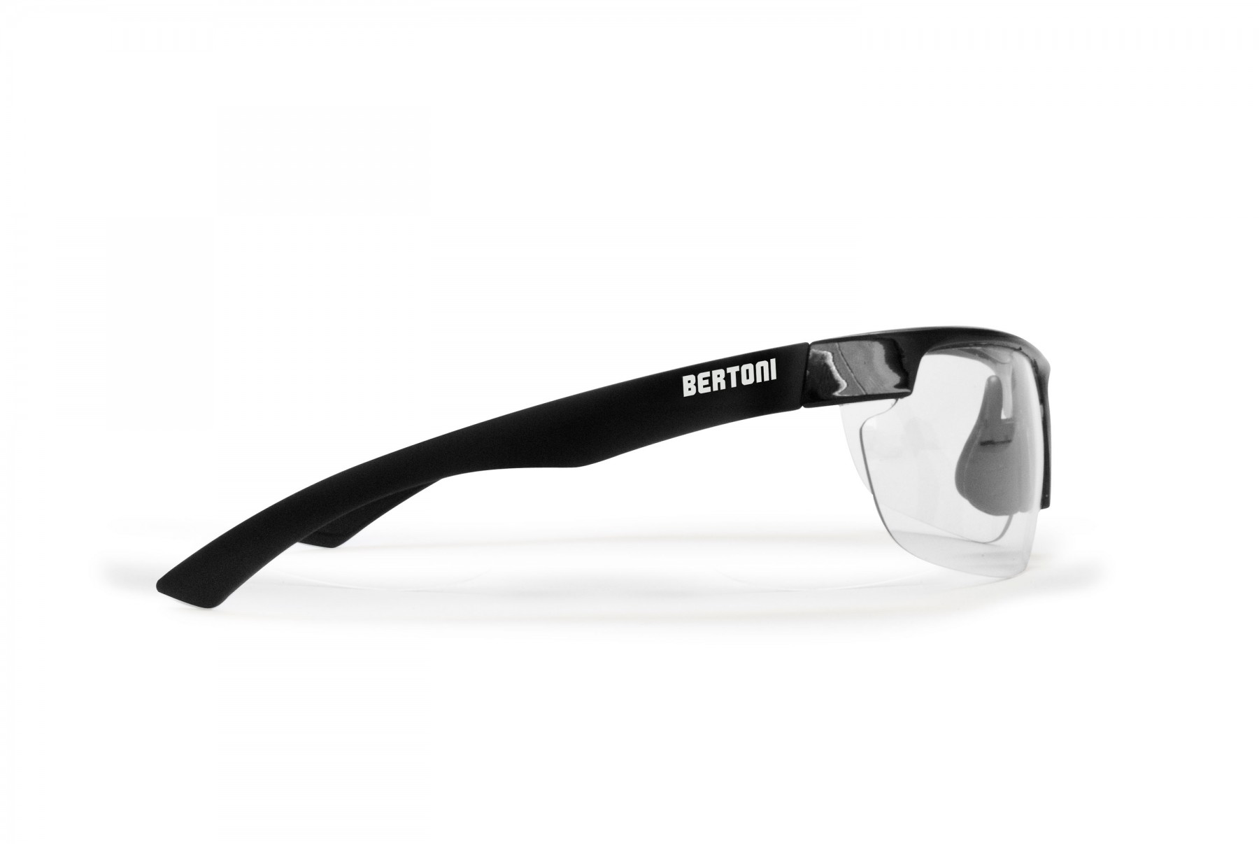 Bertoni F300 photochromic sunglasses have photochromic lenses with antifog, with increasing and decreasing exposure to UV rays, tend to clear to smoke automatically, always ensuring an excellent visual performance. The frame of the sunglasses of this collection are made by polycarbonate, a plastic material with high impact resistance, lightweight and durable. Photochromic lenses in shockproof polycarbonate protect the eyes every day, in the presence of sunlight, overcast or intermediate weather conditions. In addition, they are treated with a special resin which removes the condensation that forms on the lens surfaces in the transition from hot to cold. The reaction time of the photochromic lenses are very fast as 8 seconds to go from clear to smoke, and 35 seconds from smoke to clear.