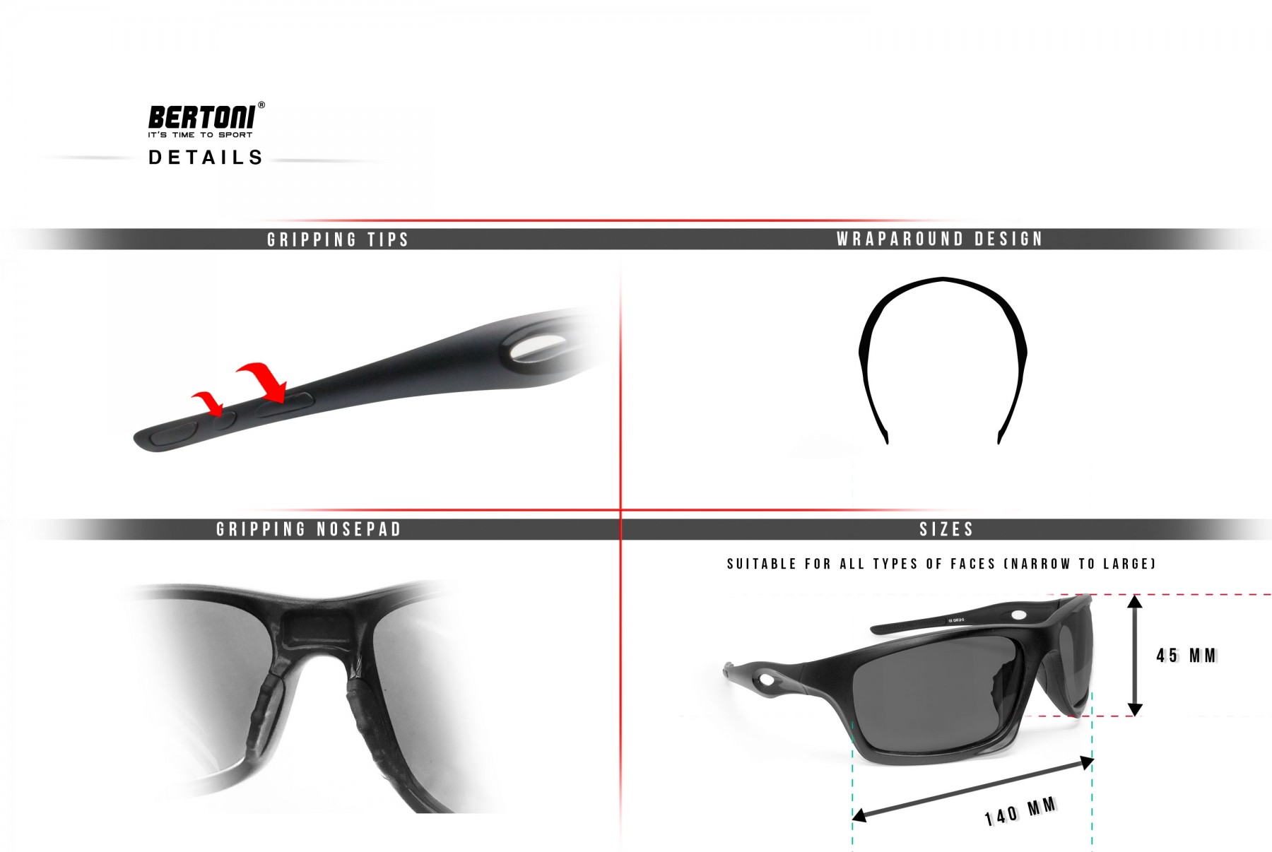 • Grip at the tip of the arms and nose-pad, keeps the sunglasses from slipping.