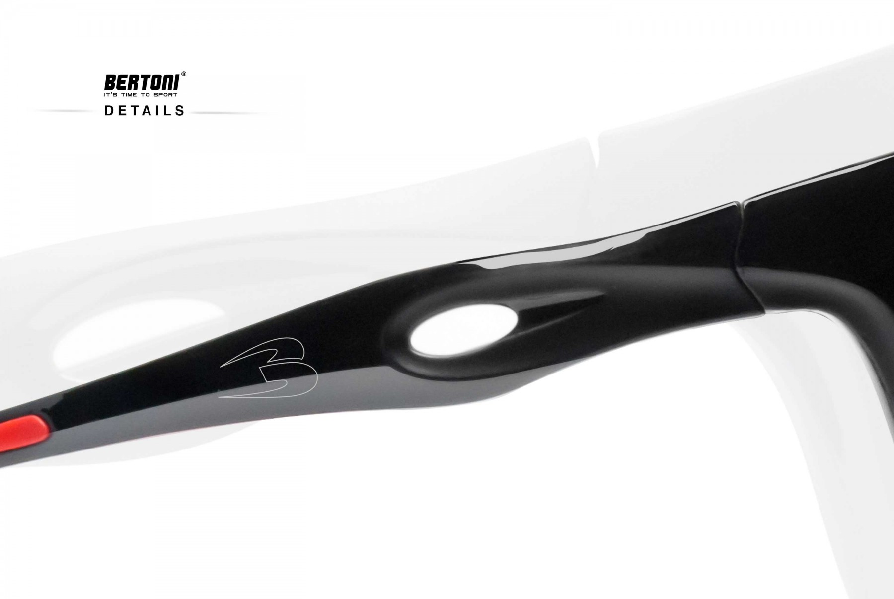 • Available in 2 matt black / glossy black colors with contrasting beautifiers details. On the occasion of Bertoni's thirtieth anniversary in the world of sports eyewear, Omega, the new born of the house, was laser-branded on the arm with the original “B” 90s logo.
