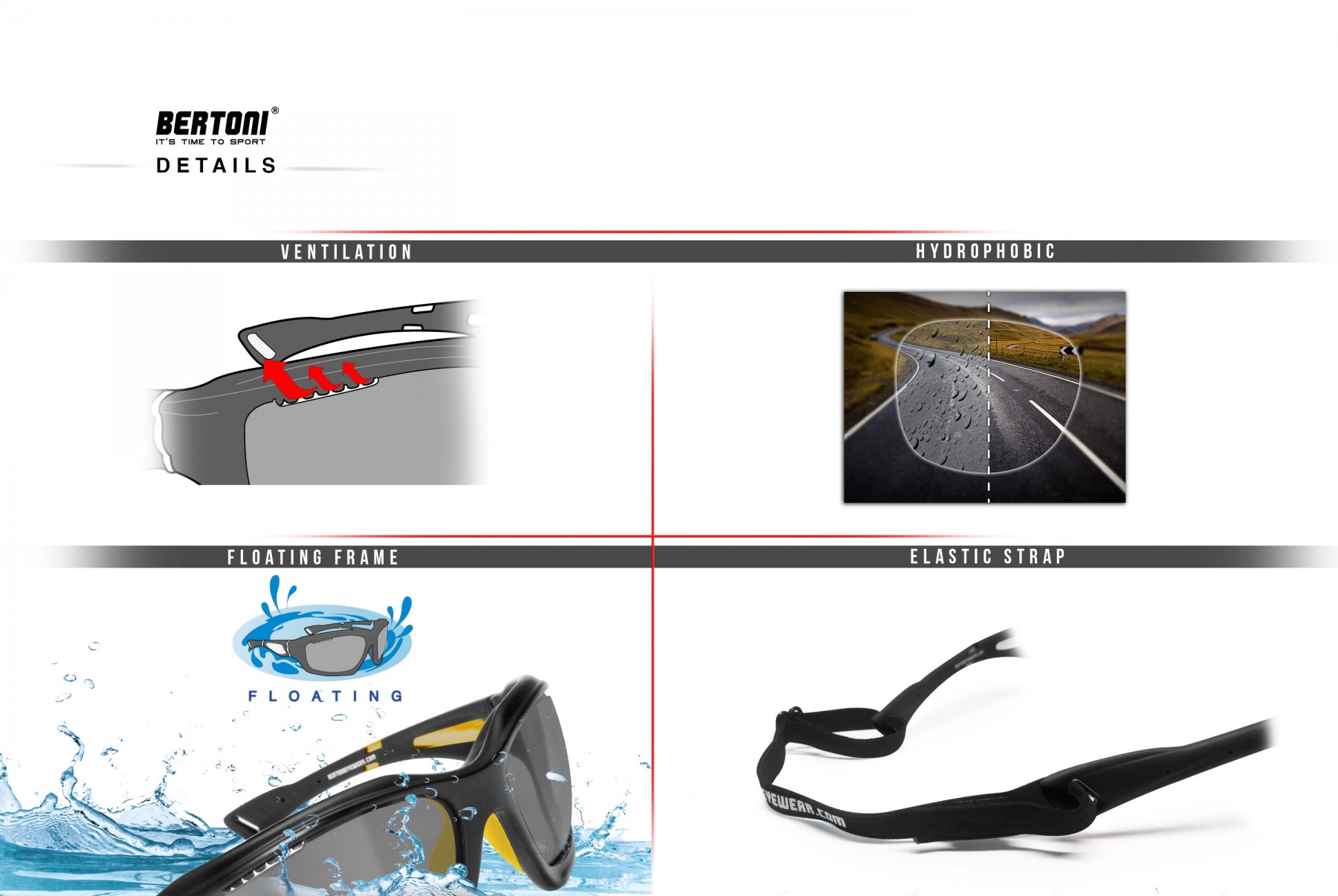 Sports sunglasses with polarized lenses and holes for hyperventilation. The frame is made by TPX, a floating material, extra strong, durable and light. This feature, together with polarized lenses and the comfort make them perfect for water sports and fishing. Many surfaces reflect the rays of the sun like a mirror (glass, water, snow), amplifying the intensity. It must therefore be equipped with good protection for the eyes against the glare. The polarized lens sunglasses of this collection are the perfect solution for this kind of problems, thanks to the special anti-reflective coating.