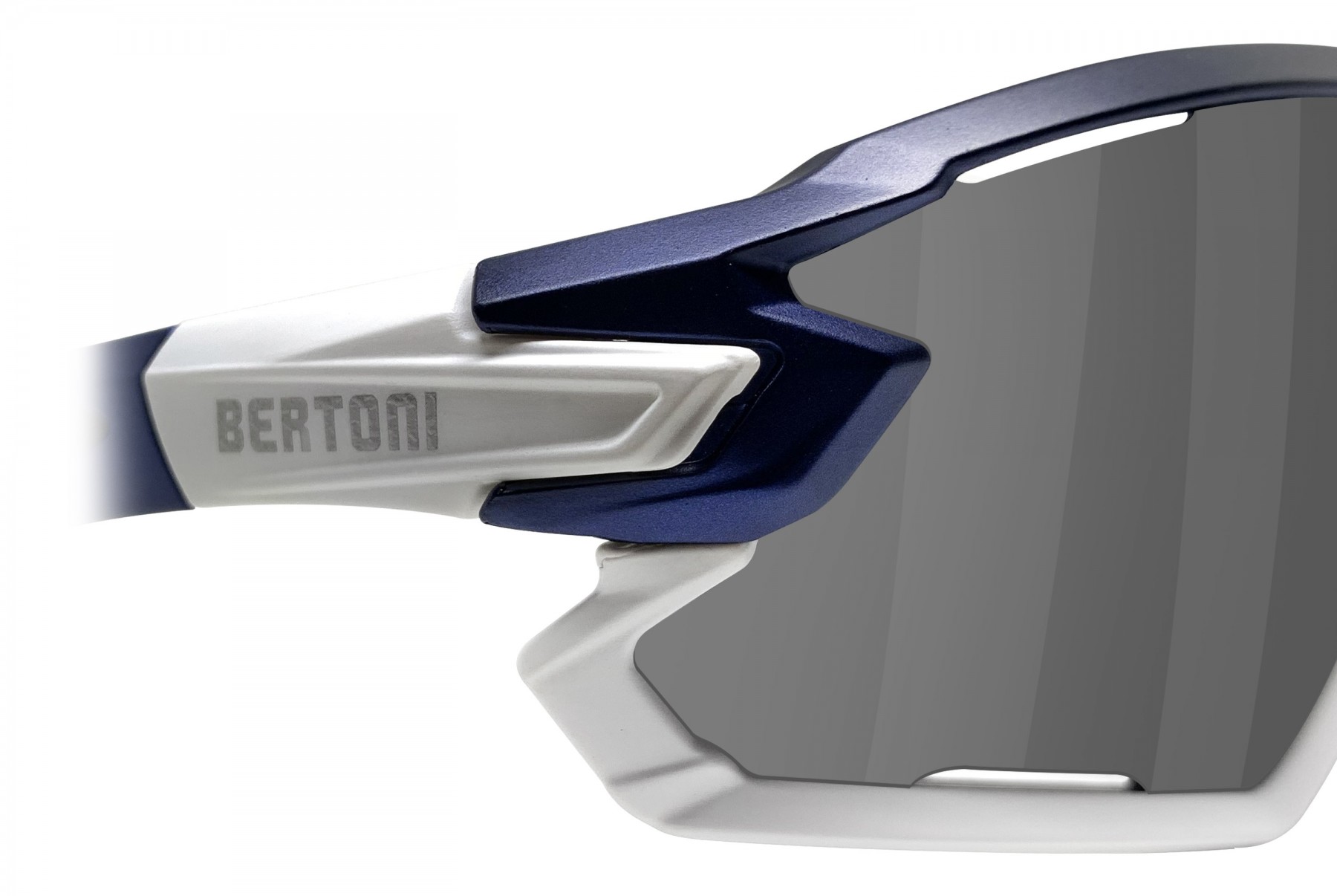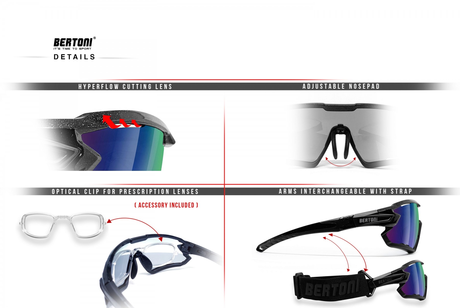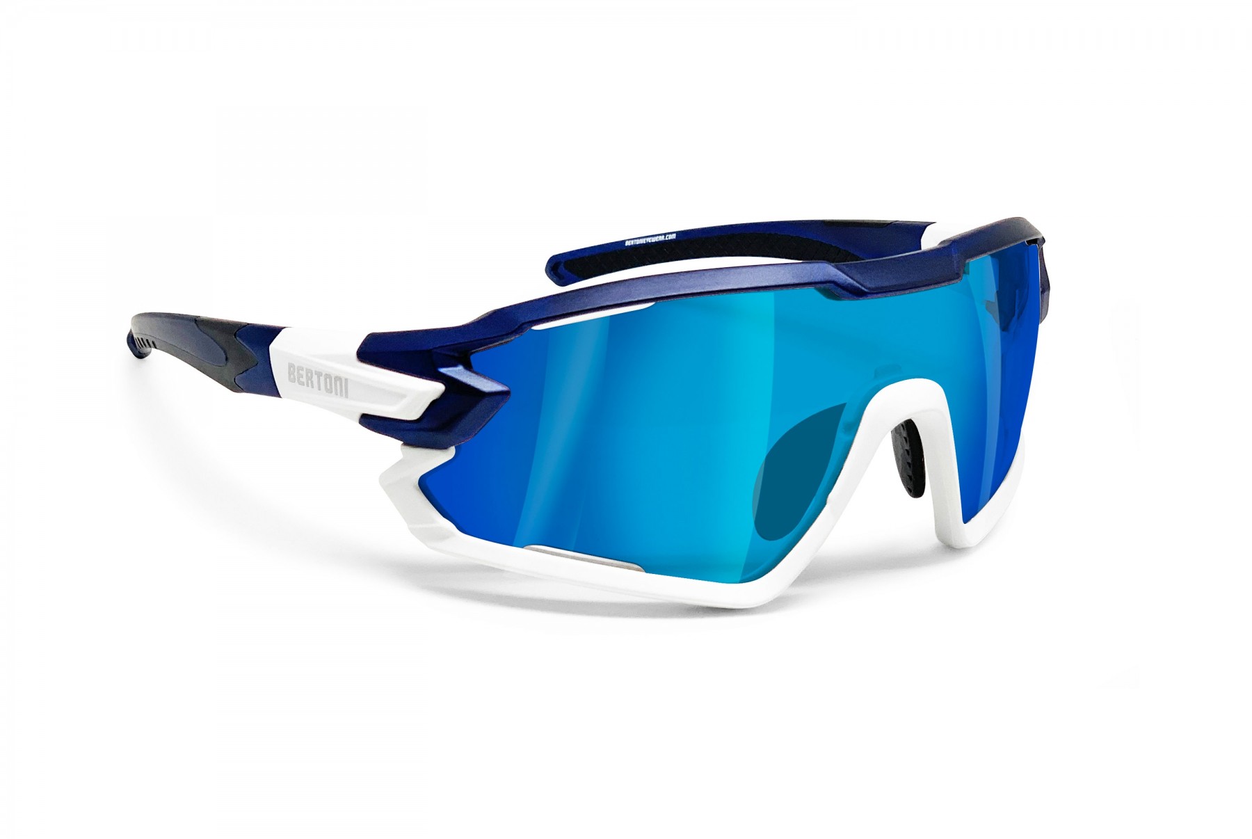 PRODUCT: Quasar by Bertoni Italy - TR90 frame, polymer structure made in Swiss, extremely lightweight and resistant, weight 33gr. - Wraparound design: protects the eyes from the wind and weather, provides a better peripheral vision - Dimensions: suitable for all types of face (from narrow to large). The straight temples are perfect and comfortable even under bike helmets. The temples can be easily replaced by the elastic strap obtaining an even more adherent and secure fit, for MTB or for extreme sports. LENSES: Blue mirror lenses provide exceptional light transmission control (VLT 12% blocks 88%), with a color adjustment specially designed to maximize contrast and improve visibility. All the lens 100% UV400 protection coating, blocks 100% harmful UVA & UVB Rays. Lenses are decentered in order to avoid any optical distorsion. OTHER FEATURES: Ergonomic soft adjustable nosepad offers an exceptional fit for any shape of face. This system also allows to adjust the glasses’ height and their distance from the face to prevent misting - Thanks to their excellent grip at arms, at the adjustable nose pads and thanks to the elastic strap, this sunglasses will stay in place. Hyperflow cutting lenses which avoid condensation. ACCESSORIES: The package includes an OPTICAL CLIP for prescription lenses, if necessary. The clip is easily mountable and removable inside the frame as shown in the pictures. Your trusted optician will be able to easily mount your prescription lenses on the clip allowing you to wear sports windproof eyeglasses without any limit of gradation - Adjustable black elastic band with black embossed logo - Semi-rigid case - Cleaning cloth - Box - Instructions with QR code. INFO: all BERTONI models are covered by a CE warranty, enjoy lifetime assistance and can be returned within 30 days from the date of purchase.