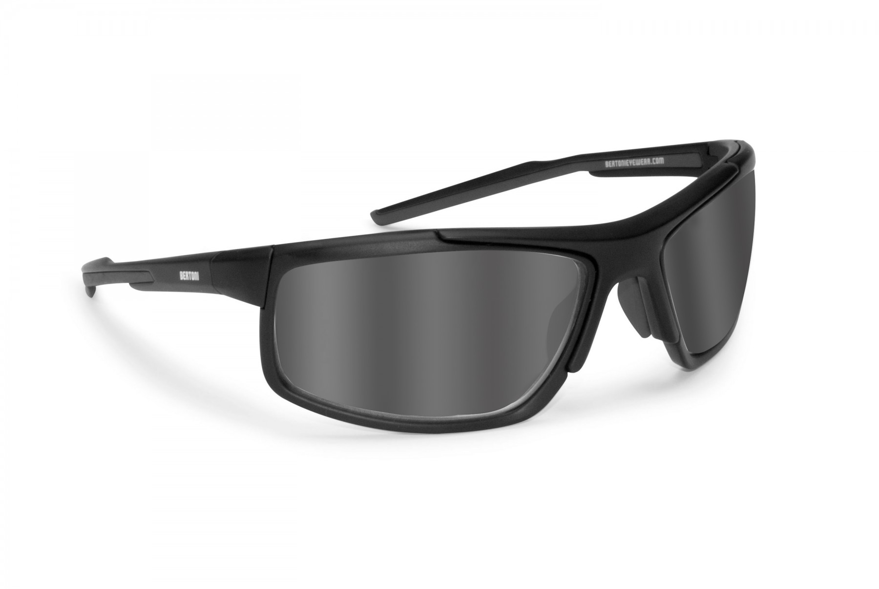 Sport sunglasses with photchromic polarized lenses by Bertoni Italy P180FT. Made in TR90LX , Carbon and Nylon mesh material, stress-resistant and impact-resistant, extremely light. These characteristics are due to the chemical composition of this material unique in its kind, 70% Nylon 30% Carbon. It is 20% lighter than conventional nylons and offers greater resistance to shock and traction. It offers a greater resistance to high temperatures without deformation. Due to its flexibility and strength the TR90LX is the safest material for sportive use in optical, in fact, the resistance of the head frame of accidental collisions has demonstrated a strong structural integrity. This special material also ensures an exponential increase of the frame duration in the time. Lenses are in PC Photochromic 2,2mm. of thickness anticrash and coated by an antifog resin. Sportig people will be captivated by the characteristics of this PHOTOCROMIC which darken and lighten automatically depending on the UV light exposure. The lens are treated with a special resin which removes the eventual condensation. Adjustable nosepad , double injection temples. Suggested Sports: cycling, running, motorbike, ski, golf, skydiving. Bertoni provides lifetime after sale service for all Bertoni goggles and sunglasses - Additional Information