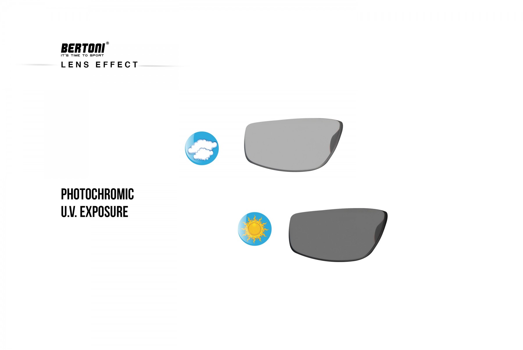 Sport sunglasses with photchromic polarized lenses by Bertoni Italy P180FT. Made in TR90LX , Carbon and Nylon mesh material, stress-resistant and impact-resistant, extremely light. These characteristics are due to the chemical composition of this material unique in its kind, 70% Nylon 30% Carbon. It is 20% lighter than conventional nylons and offers greater resistance to shock and traction. It offers a greater resistance to high temperatures without deformation. Due to its flexibility and strength the TR90LX is the safest material for sportive use in optical, in fact, the resistance of the head frame of accidental collisions has demonstrated a strong structural integrity. This special material also ensures an exponential increase of the frame duration in the time. Lenses are in PC Photochromic 2,2mm. of thickness anticrash and coated by an antifog resin. Sportig people will be captivated by the characteristics of this PHOTOCROMIC which darken and lighten automatically depending on the UV light exposure. The lens are treated with a special resin which removes the eventual condensation. Adjustable nosepad , double injection temples. Suggested Sports: cycling, running, motorbike, ski, golf, skydiving. Bertoni provides lifetime after sale service for all Bertoni goggles and sunglasses - Additional Information