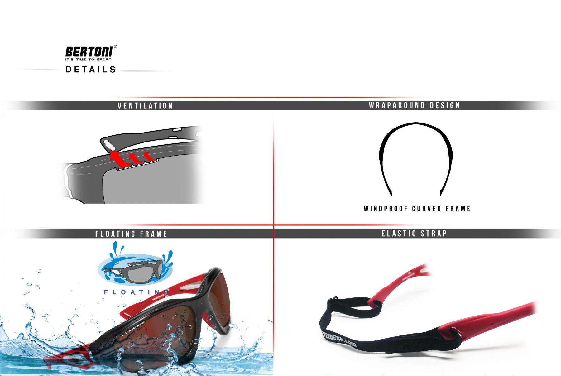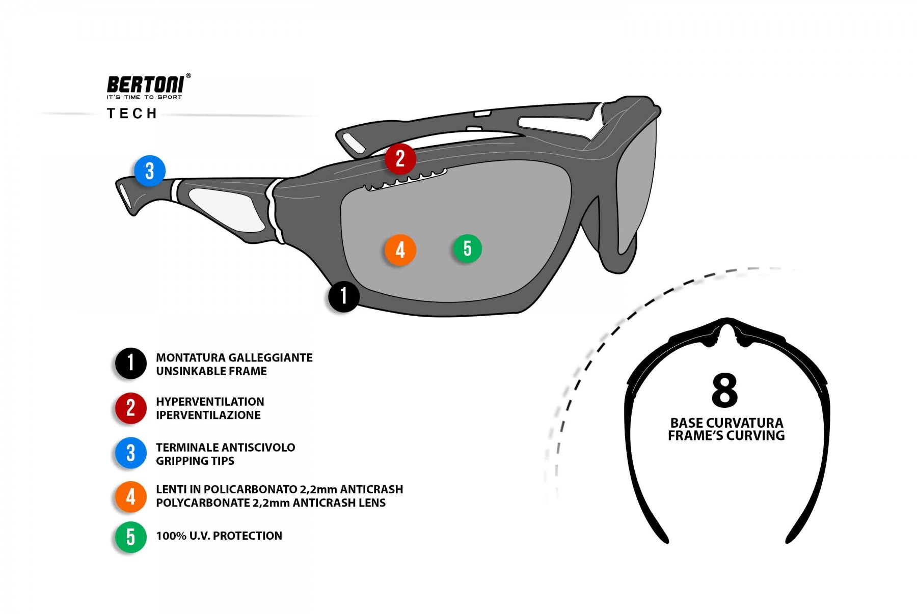 • Occhiali Sportivi prodotti in leggerissimo TPX per Ciclismo MTB Running - Fori di Ventilazione Forzata - Bertoni italy - FT1000B:
